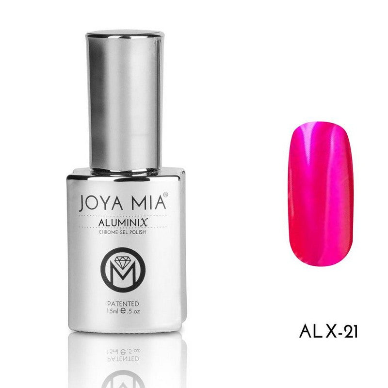 Joya Mias Aluminix Chrome Gel applied over Silver Base creates high-shine chrome nails in 24 different colors for a gorgeous...